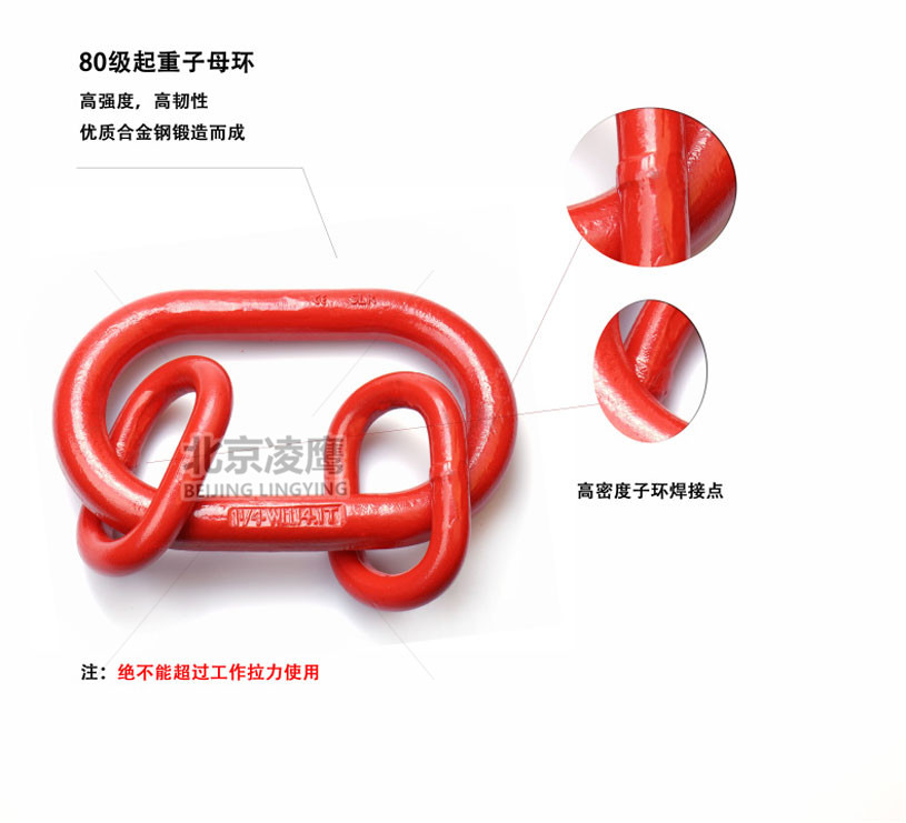 子母环属于强力环的一种,采用优质碳素结构钢或合金结构钢锻造并进行热处理而成,具有体积小、重量轻、强度高等特点, 试验载荷为额定载荷的2倍,破断载荷为额定载荷的4倍。本产品严格按国家3包执行,产品质量由中国人民保险公司(PICC)承保,请放心使用。