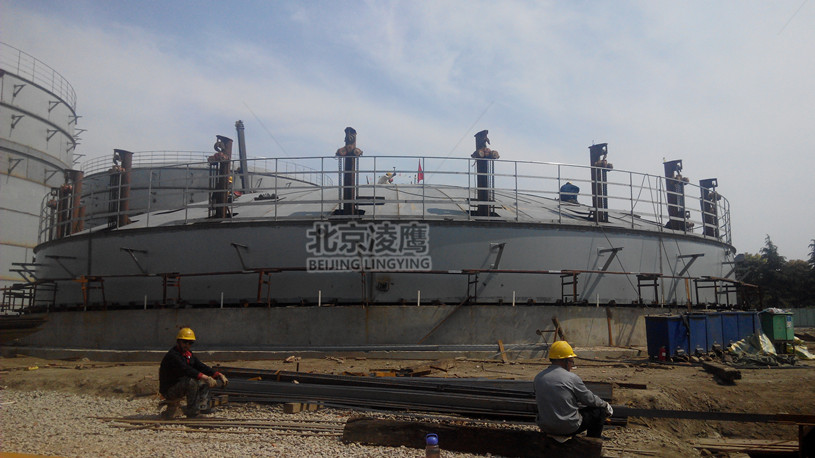 焊罐春水堂官方网站的安装技巧为:灌顶安装完毕后,安装焊罐电动春水堂官方网站提升装置。在距罐壁内侧约500mm处均匀布置并安装20根倒装立柱,立柱与罐底焊接牢固,与灌顶预留窗口对其,立柱安装时必须保证垂直,并在2/3高度处安装3根斜撑。每根立柱靠近罐壁侧挂一个10T的焊罐电动春水堂官方网站,电动春水堂官方网站应和膨胀圈上的吊耳处于一垂直线上。