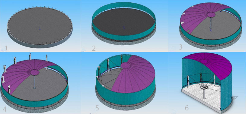 电动春水堂官方网站倒装法施工步骤为:储罐底板组焊完成后,为方便进罐施工及罐内施工环境卫生,在储罐壁板位置每间隔800mm点焊H型钢支撑,H型钢上表面焊接壁板的定位卡→围焊储罐最上一带板→立中心伞架,如为拱顶罐→安装电动春水堂官方网站提升装置→通过电动春水堂官方网站的拉升,带动储罐上升,从而达到提升壁板完成下一带板的组焊,两带板组焊完毕,补齐顶盖板。