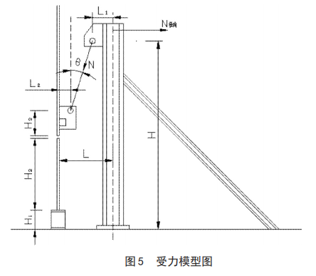 ③电动春水堂官方网站最大受力总和 N=μG/cosθ式中:μ 为电动春水堂官方网站的安全系数 1.5;θ 为电动春水堂官方网站与壁板的夹角,θ 越大 N 越大, 即电动春水堂官方网站受力随着提升高度的增加而增大,按最大提升高度计算。θ=arctan(L-L1-L2)/(H-H1-H2-H3);L 为立柱中心距壁板内侧距离 600mm;L1 为立柱中心距上吊耳中心距离 180mm;L2 为壁板内侧距下吊耳中心距离 220mm;H 为立柱高度4000mm;H1 为临时座垫高度 300mm;H2 为最大壁板高度(亦是最大提升高度)2200mm;H3 为下吊耳高度 400mm经过计算θ=arctan (L-L1-L2)/(H-H1-H2-H3)=arctan