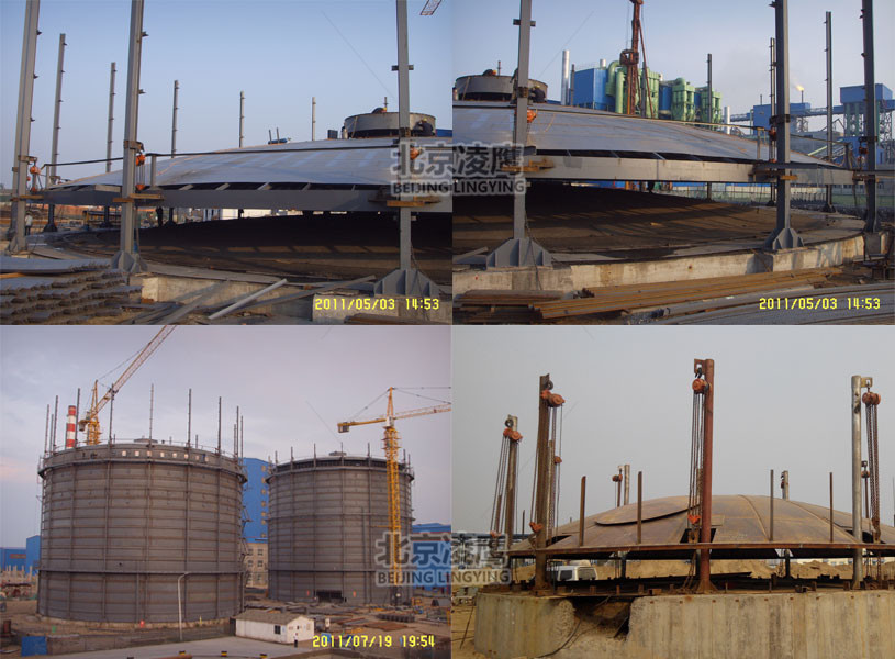 配件安装与罐体试验:储罐施工安装时将罐体所有人孔、进入料管、检测孔、通气孔、透光孔、结合管孔和盘梯根据壁板的施工进度全部组焊完成,最后进行罐体充水试验、气密试验工作、罐底板渗透检测。